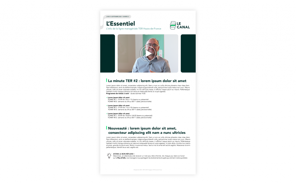 Le CANAL est une plateforme SharePoint spécialement dédiée à la ligne managériale du TER Hauts-de-France. Présent sur plusieurs supports de communication, il était essentiel de concevoir une identité visuelle forte, moderne et attrayante pour capter l’attention des managers. L’objectif de cette démarche était de les encourager à s’impliquer activement et à adopter une approche proactive au sein de cette nouvelle plateforme. Grâce à une identité graphique cohérente et engageante, le CANAL devient un outil clé pour renforcer la collaboration, stimuler les échanges et dynamiser la gestion au sein du TER Hauts-de-France.